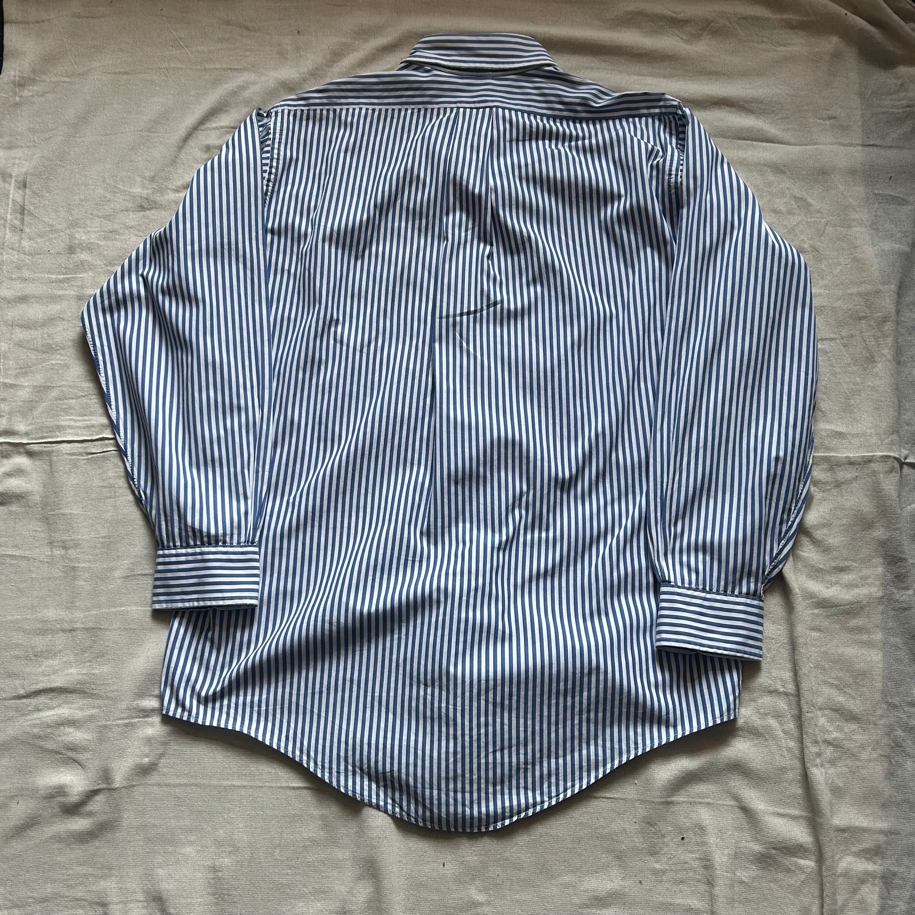 使いやすい青白のストライプにレギュラーカラーと