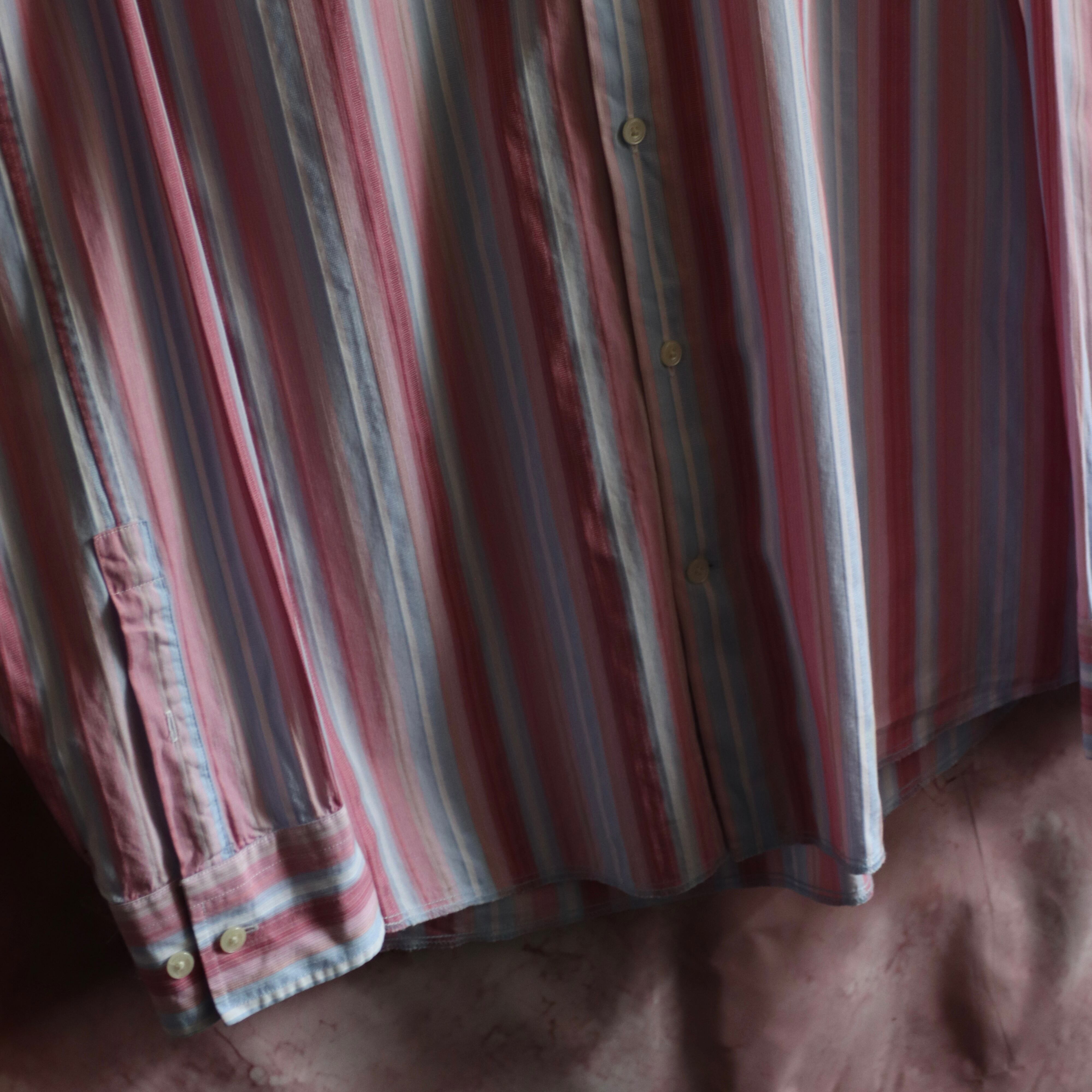鮮やかなピンクと水色の色合いのストライプシャツ。