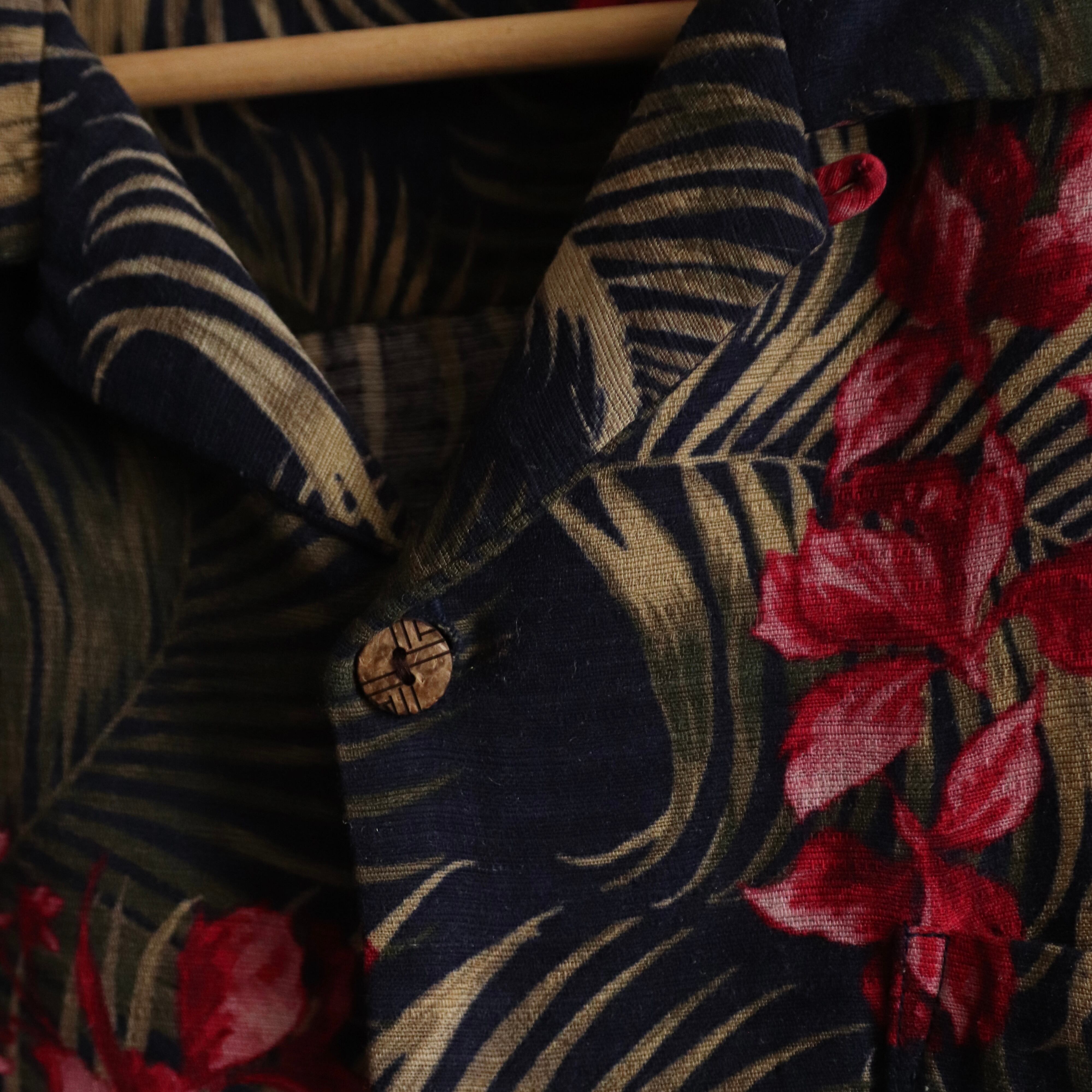 ネイビー地に発色の良い赤が差し色ではいっており色気のあるアロハシャツとなっております。