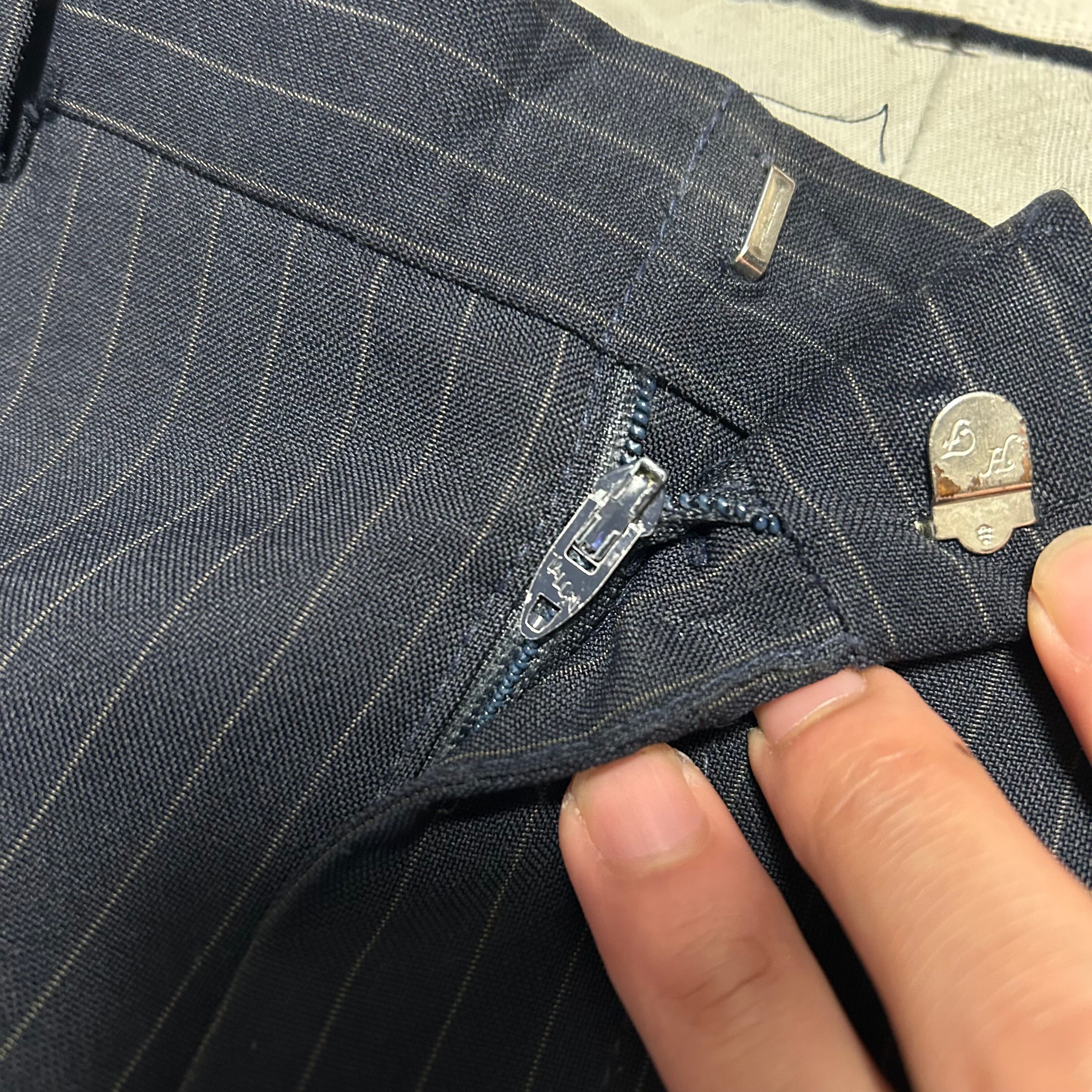 毎年人気のネイビーのストライプスラックス。